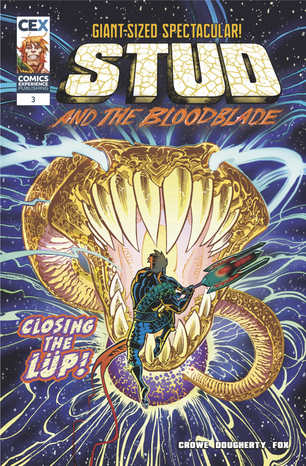 All the bashin’ and slashin’ and passion comes to this-40 freakin’ pages of flawless, phenomenal finale! With his world crumbling around him, Stud plunges into the abyss to meet Ouroboros’s maker and ignite the Next Bang! Variant Cover by comic artist Kevin Sharpe that’s as keen as the BloodBlade itself!